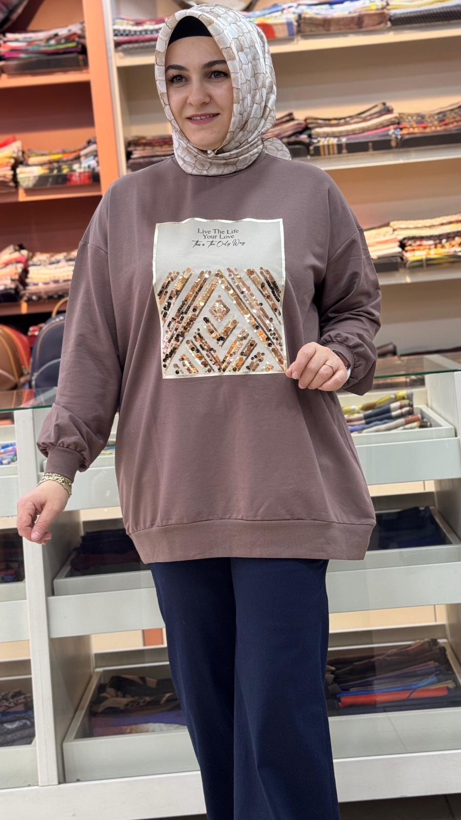 Baskılı Pul Detaylı Sweat Tunik Kahve /2695