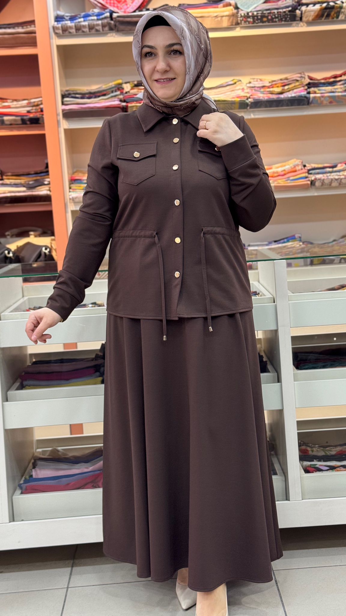Belden Büzgü Detaylı Etekli Takım Kahverengi/5026