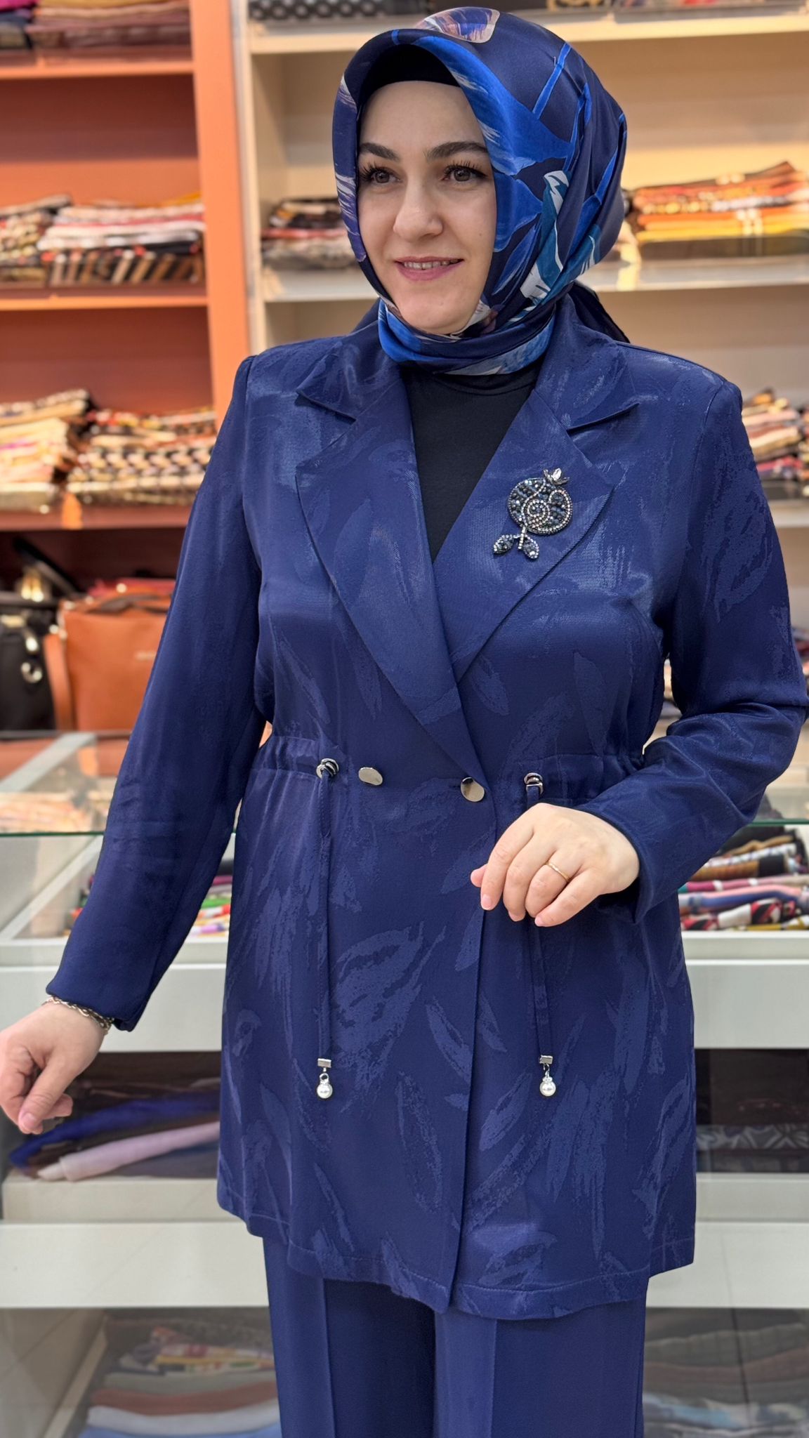 Beli Büzgü Ve Broş Detaylı Blazer Takım Lacivert / 3021