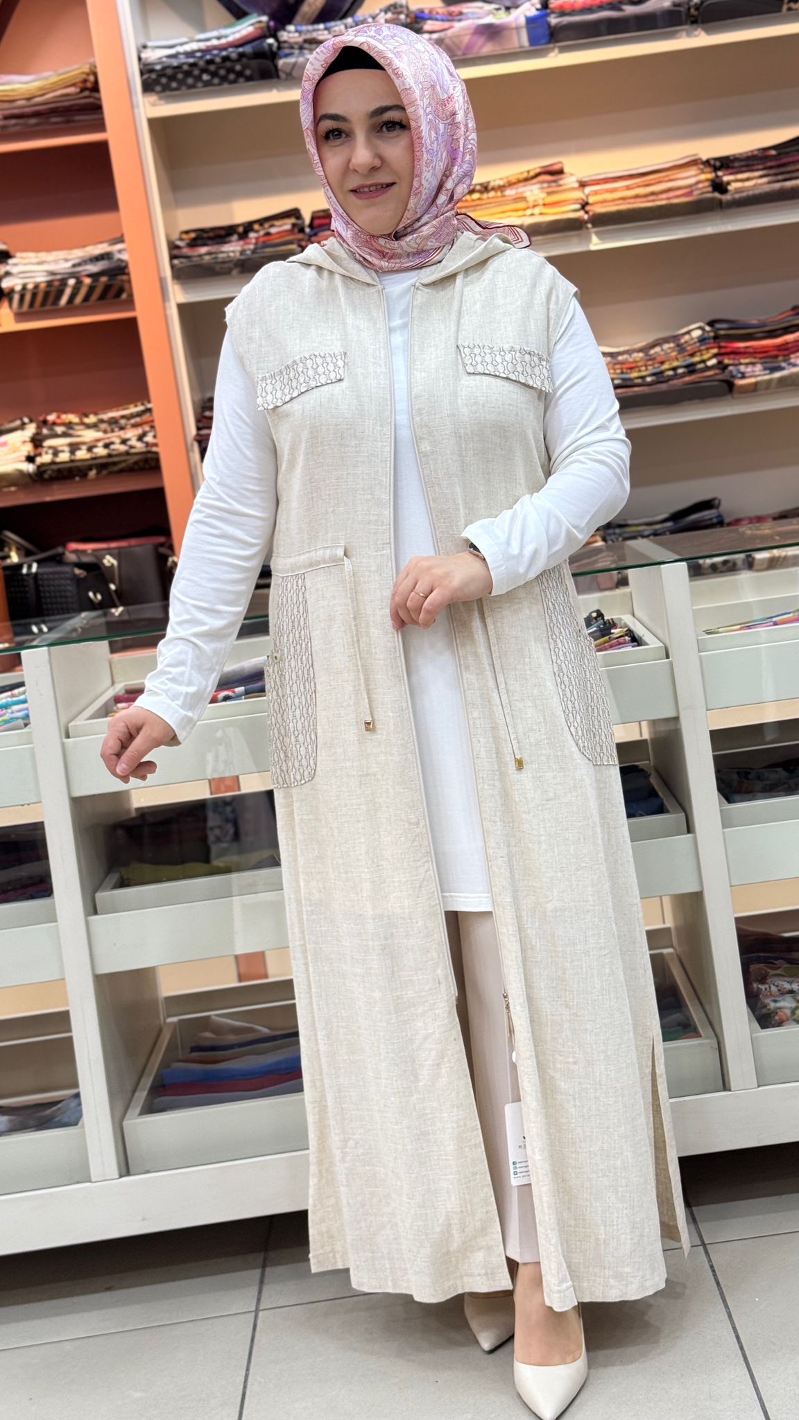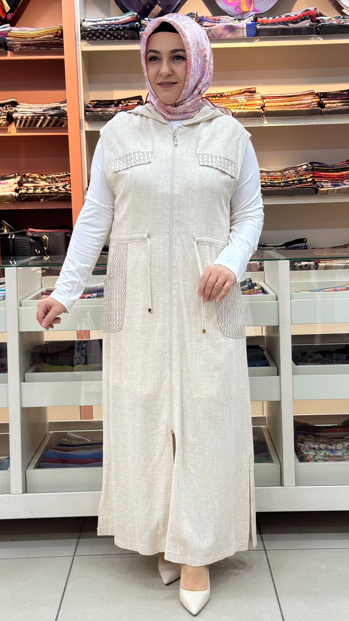 -Tunik pamuklu kumaştır. Yelek keten kumaştır.
