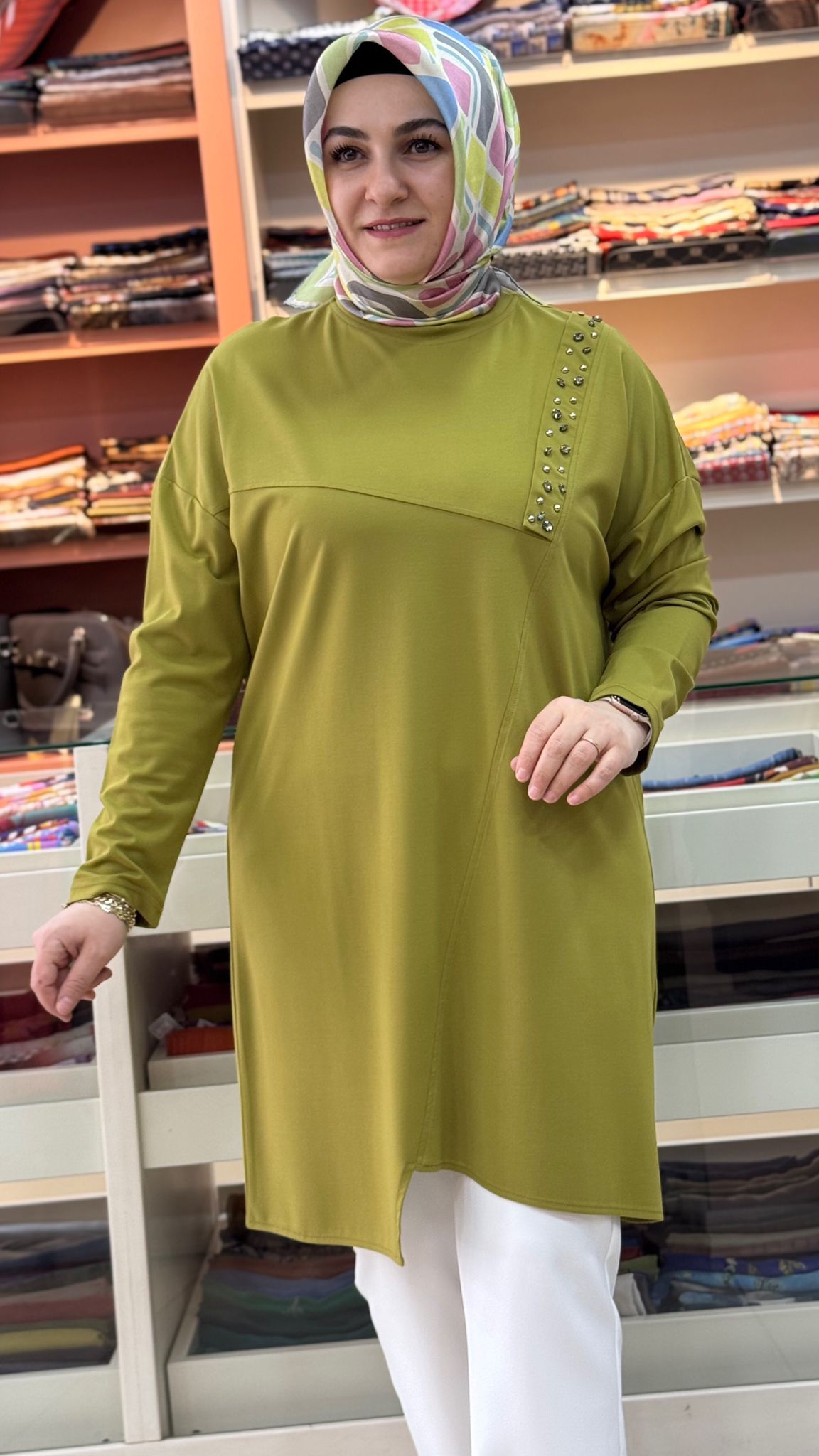 Boncuk Çakmalı Asimetrik Tunik Yağ Yeşili/30342