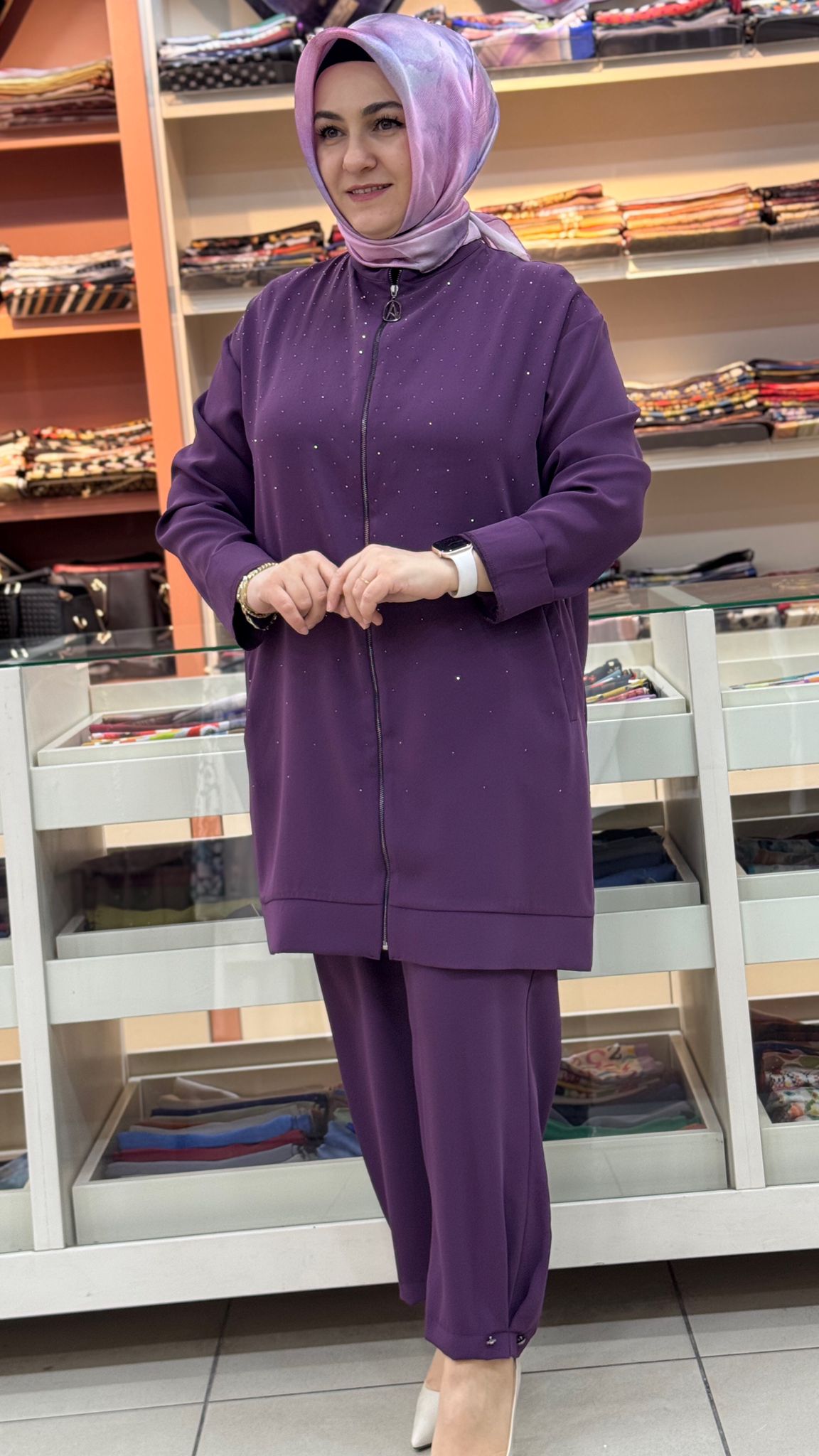 Cep Ve Serpme Taş Detaylı Pantolonlu Takım Mor/6251