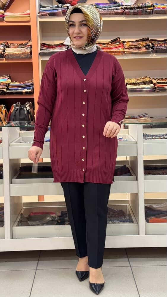 Çizgi Detaylı Triko Hırka Bordo/3199
