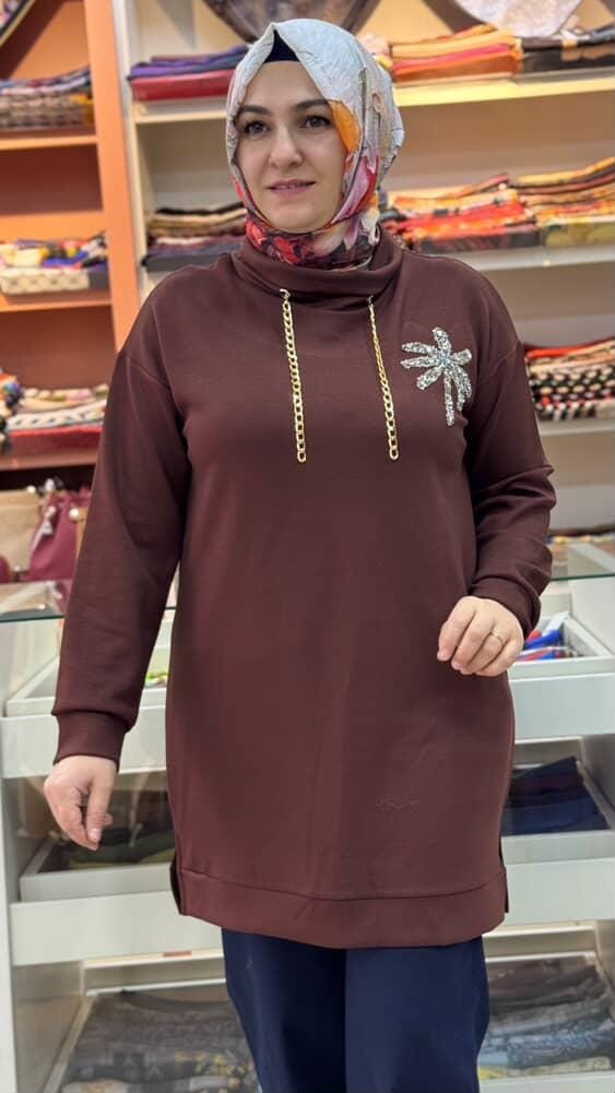 Degaje Yaka Çiçek Ve Zincir Detaylı Tunik Kahve/1856