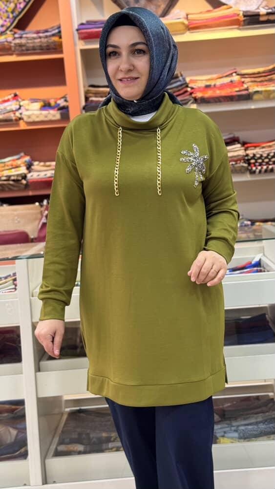 Degaje Yaka Çiçek Ve Zincir Detaylı Tunik Yeşil/1856