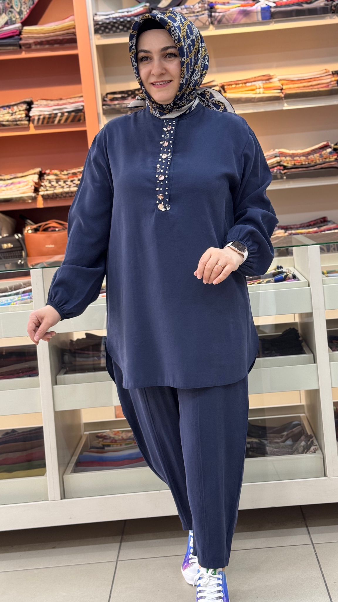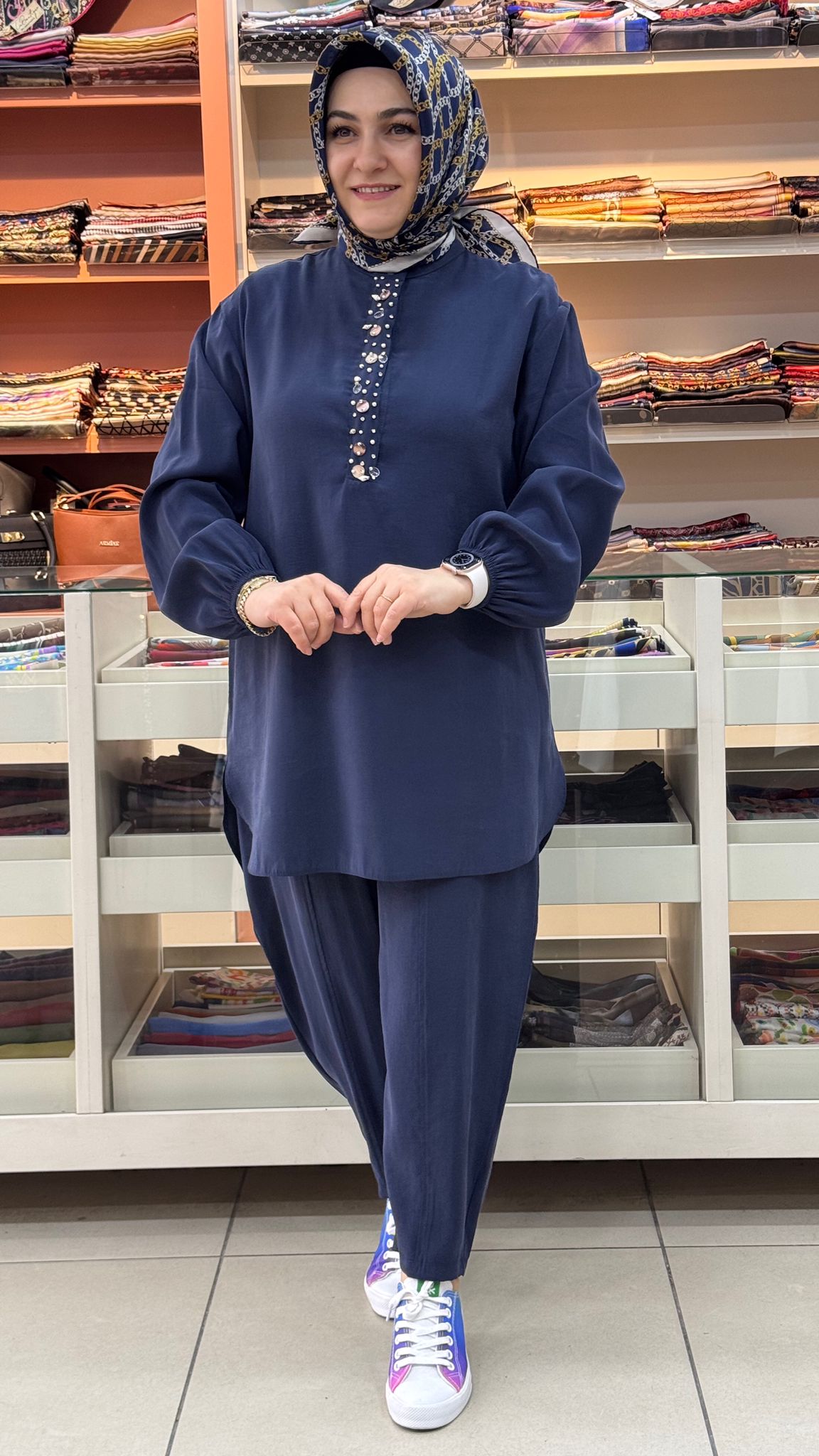 Düğme Detaylı Kolu Lastikli Takım Lacivert/14422