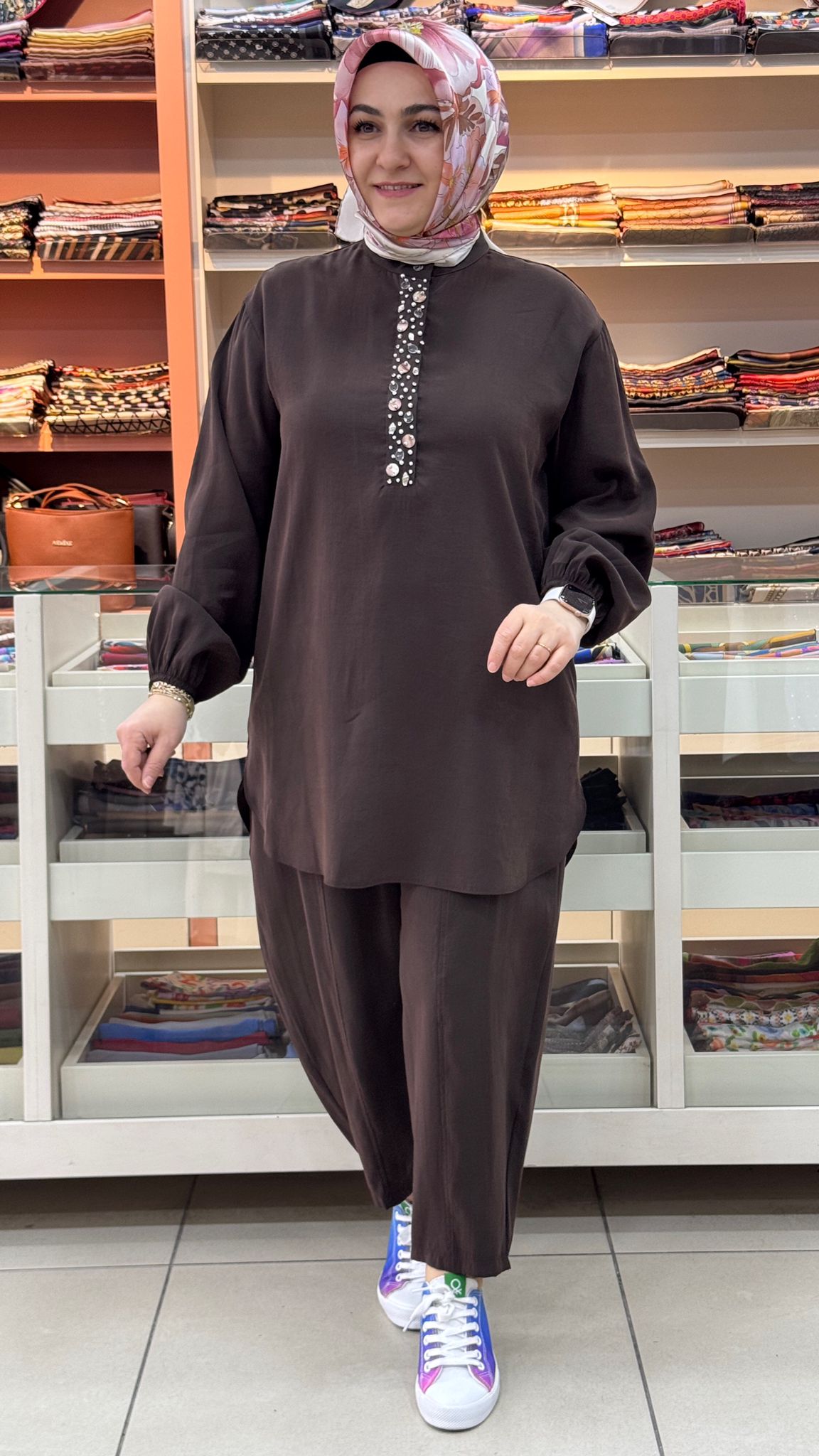Düğme Detaylı Kolu Lastikli Takım Kahverengi/14422