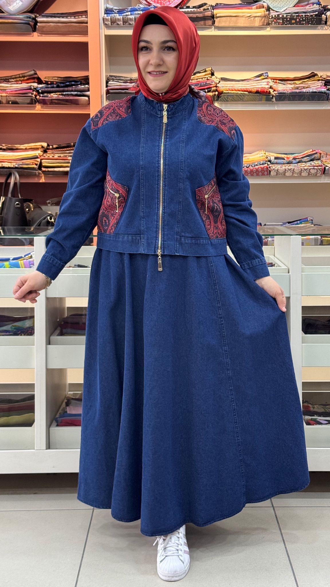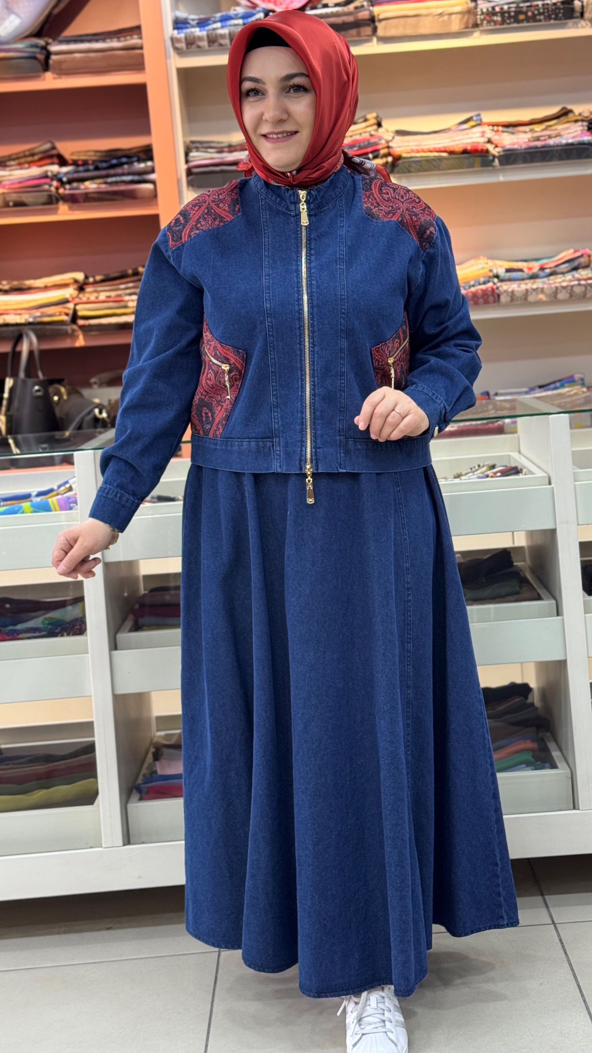Etnik Desenli Kot Etekli Takım Koyu Lacivert/10893