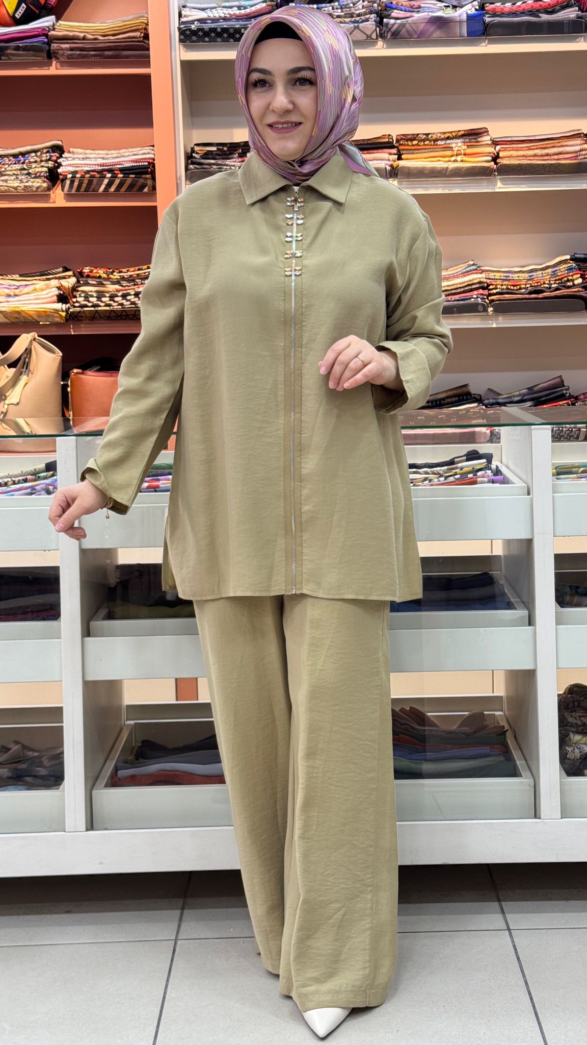 Fermuarlı Taş İşlemeli Pantolonlu Takım Yağ Yeşili/14446