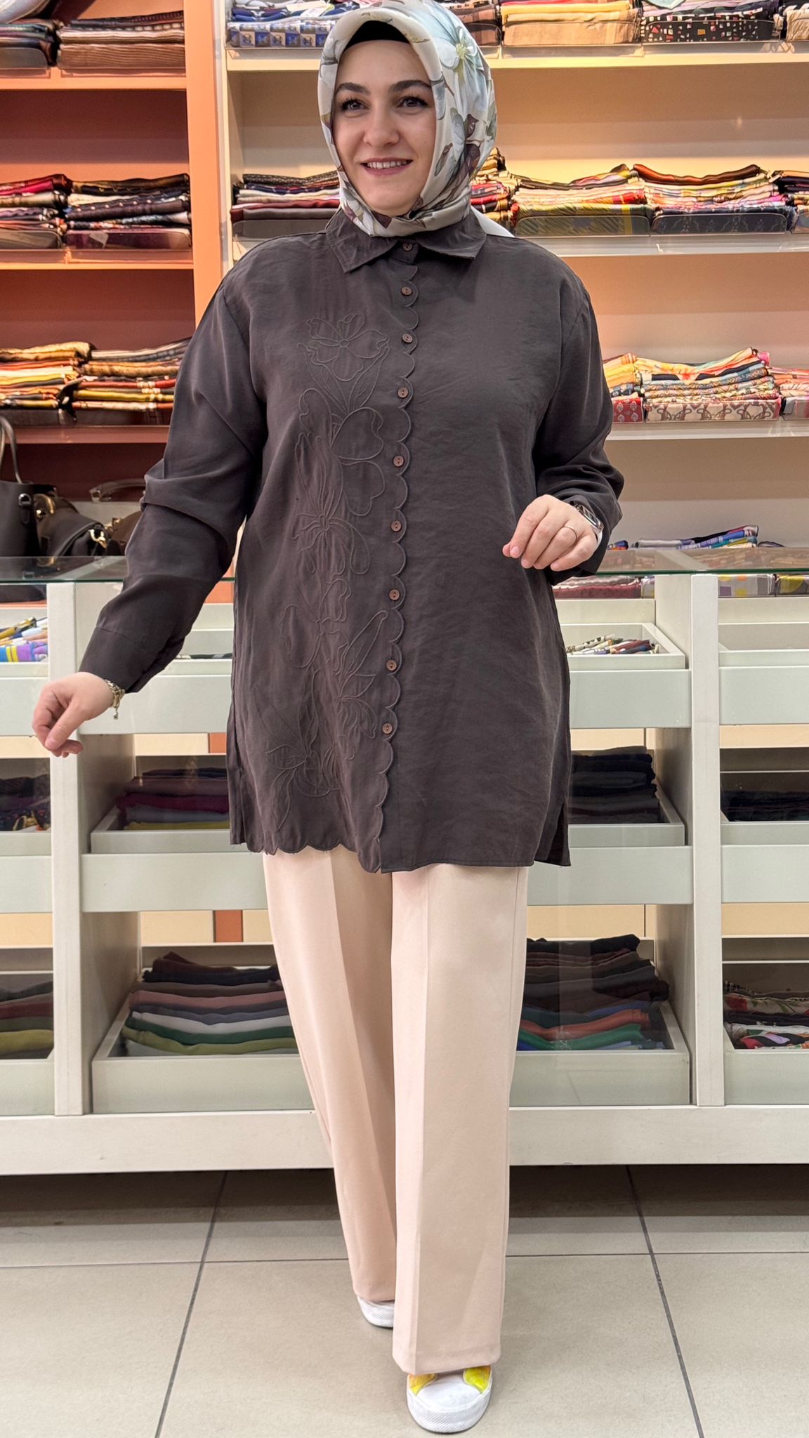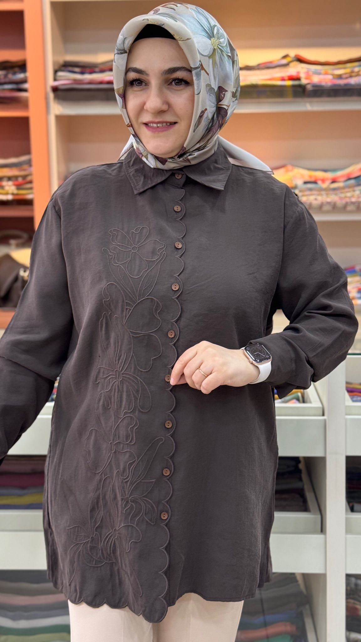 Fırfır Desen Çiçek Nakış İşlemeli Gömlek Tunik Kahverengi/260107