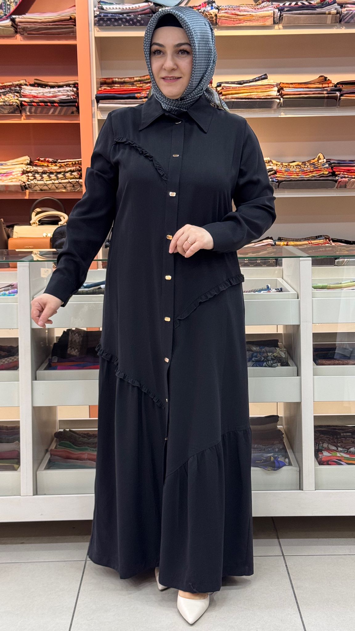 Fırfır Ve Düğme Detaylı Elbise Siyah/1175