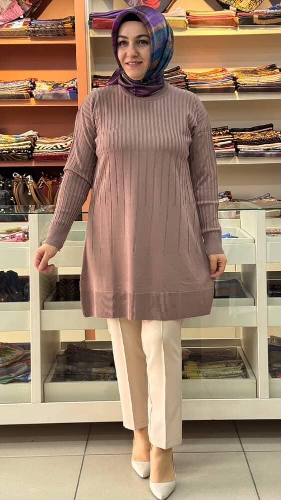 İnce Çizgili Merserize Triko Tunik Pudra/1825