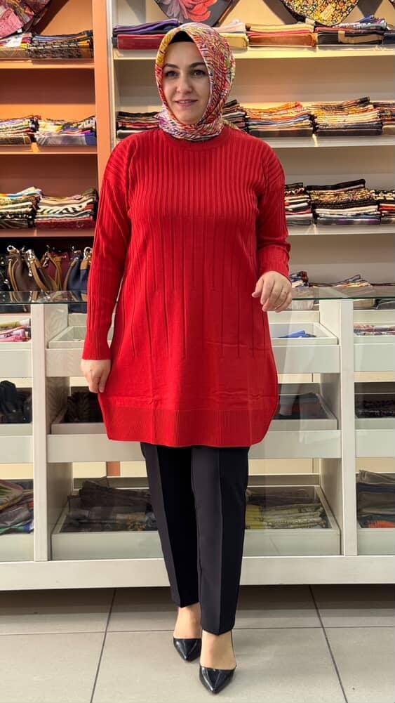 İnce Çizgili Merserize Triko Tunik Mercan/1825