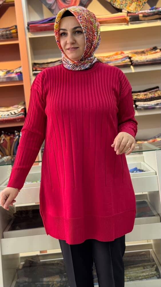 İnce Çizgili Merserize Triko Tunik Kırmızı/1825