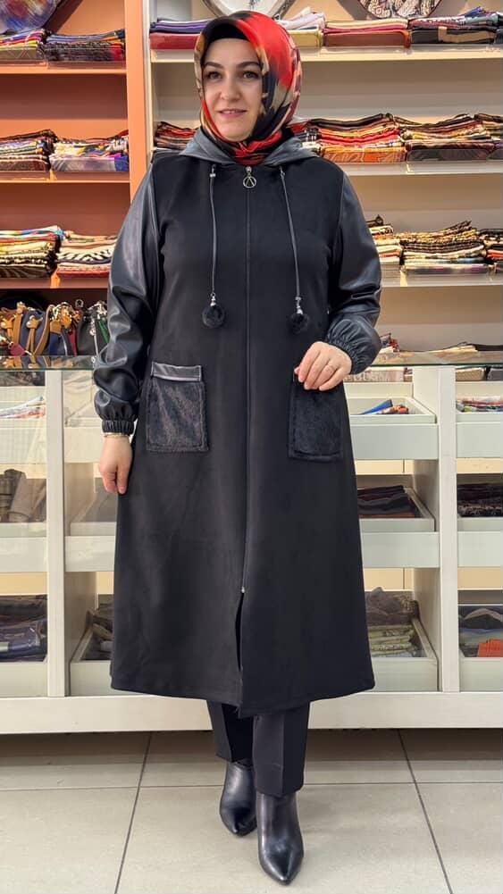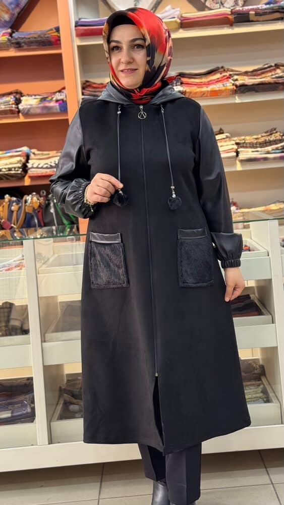Kapşonu Ve Cebi Kürklü Deri Detaylı Süet Kap Siyah/6121