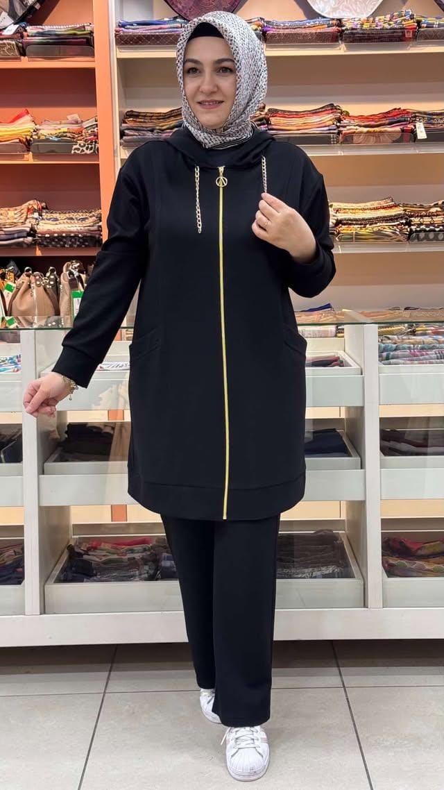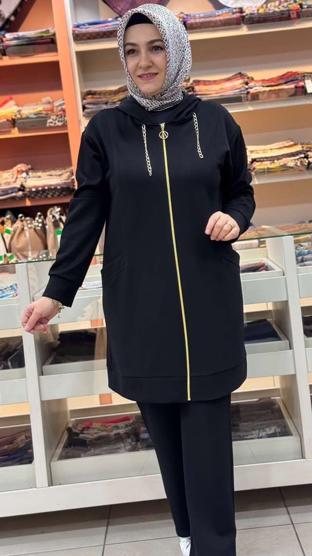 Kapşonu Zincir Detaylı Takım Siyah/1282