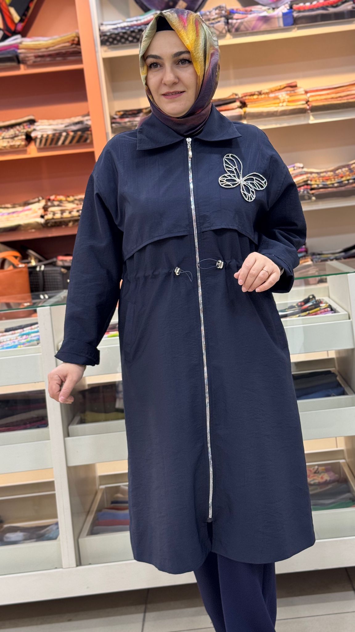 Kelebek Taş Detaylı Beli Büzgülü Kap Lacivert/15257