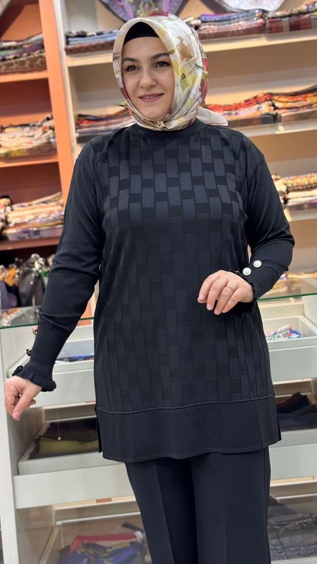 Kolu Düğme Detaylı Dama Desen Triko Tunik Siyah/1021