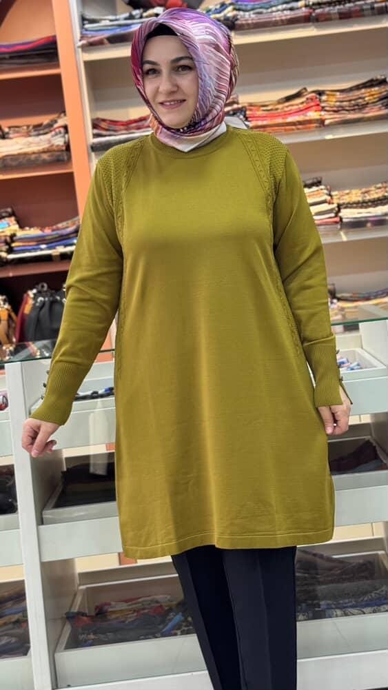Kolu Düğmeli Omzu Desenli Merserize Triko Tunik Hardal/1801