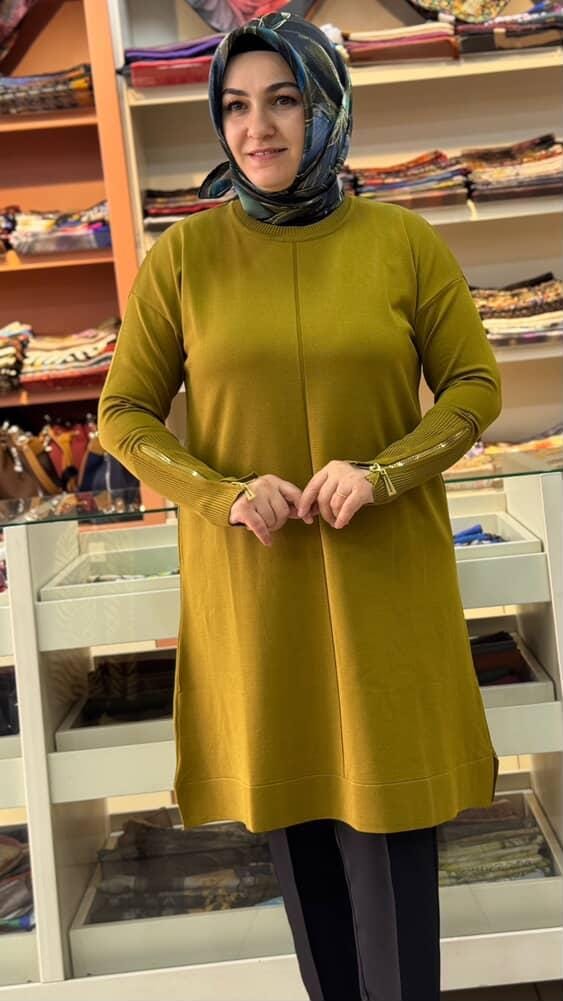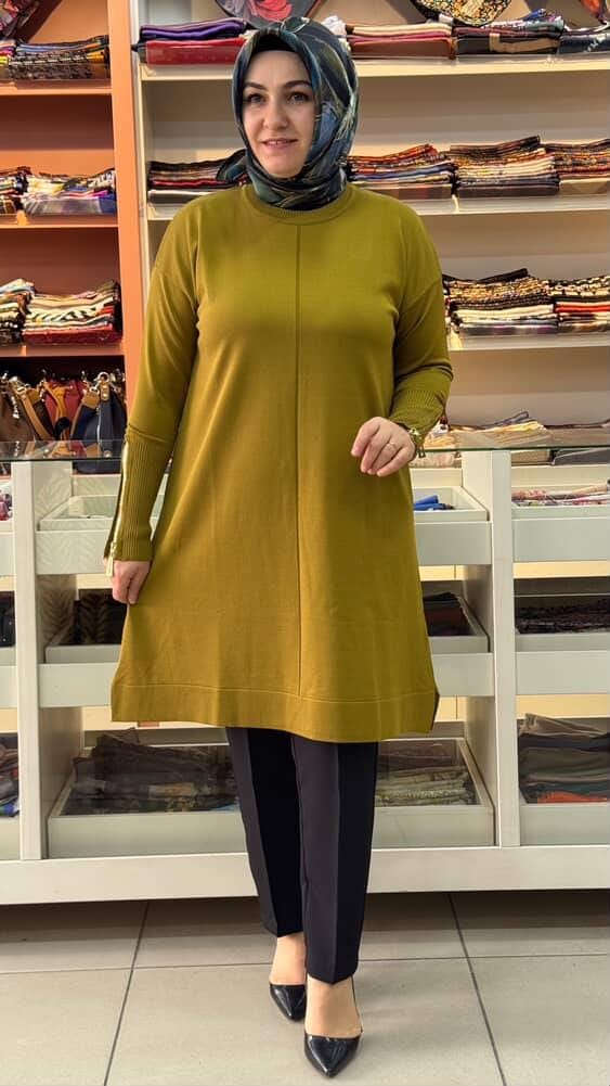 Kolu Fermuarlı Merserize Triko Tunik Yağ Yeşili/1818