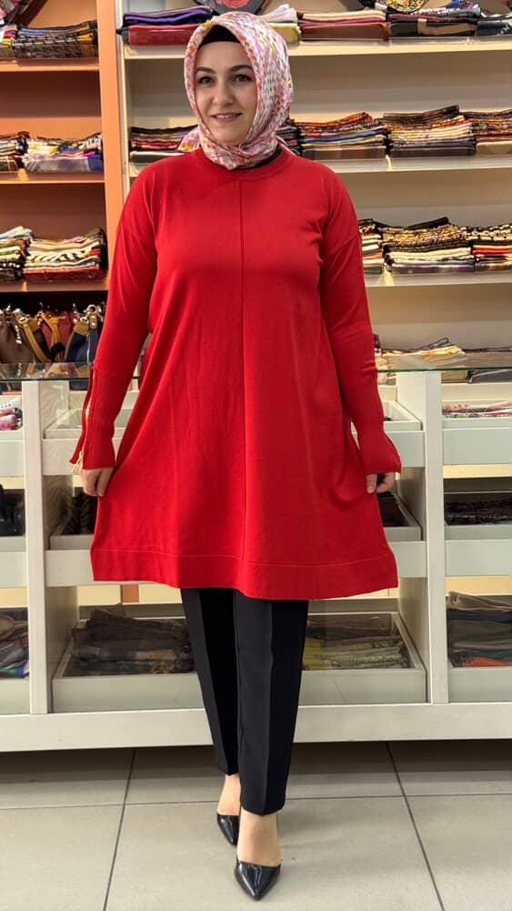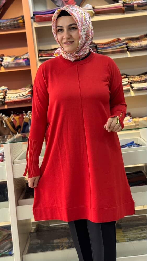 Kolu Fermuarlı Merserize Triko Tunik Mercan/1818