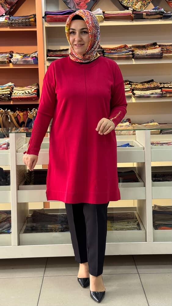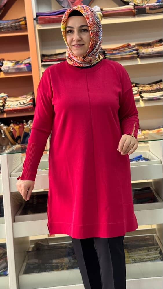 Kolu Fermuarlı Merserize Triko Tunik Kırmızı/1818