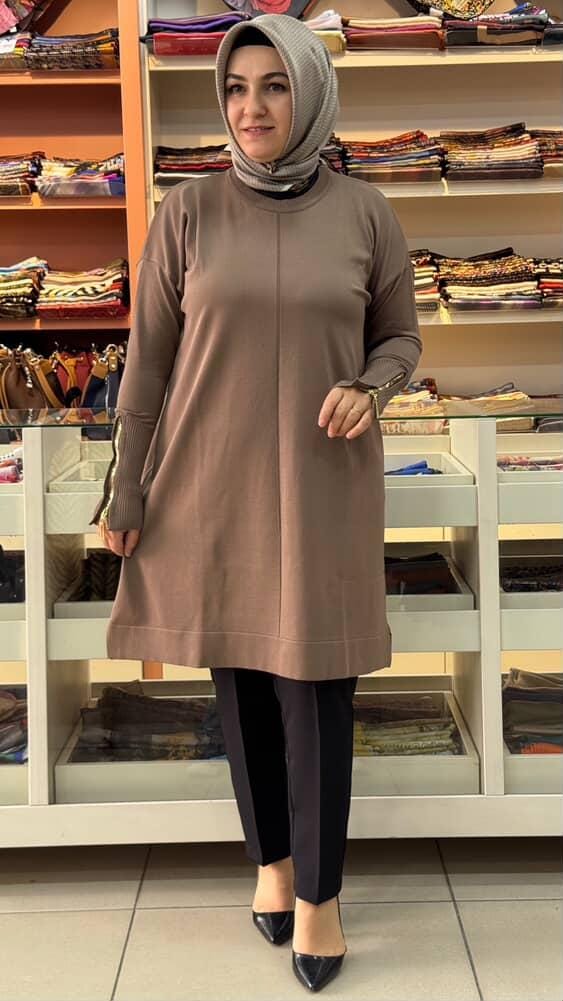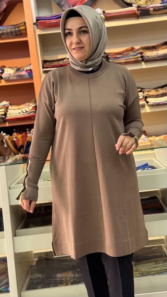 Kolu Fermuarlı Merserize Triko Tunik Koyu Vizon/1818