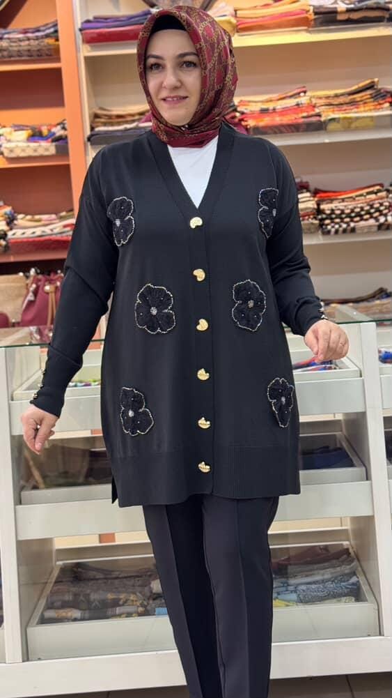 Organze Çiçek Detaylı Hırka Siyah/15039