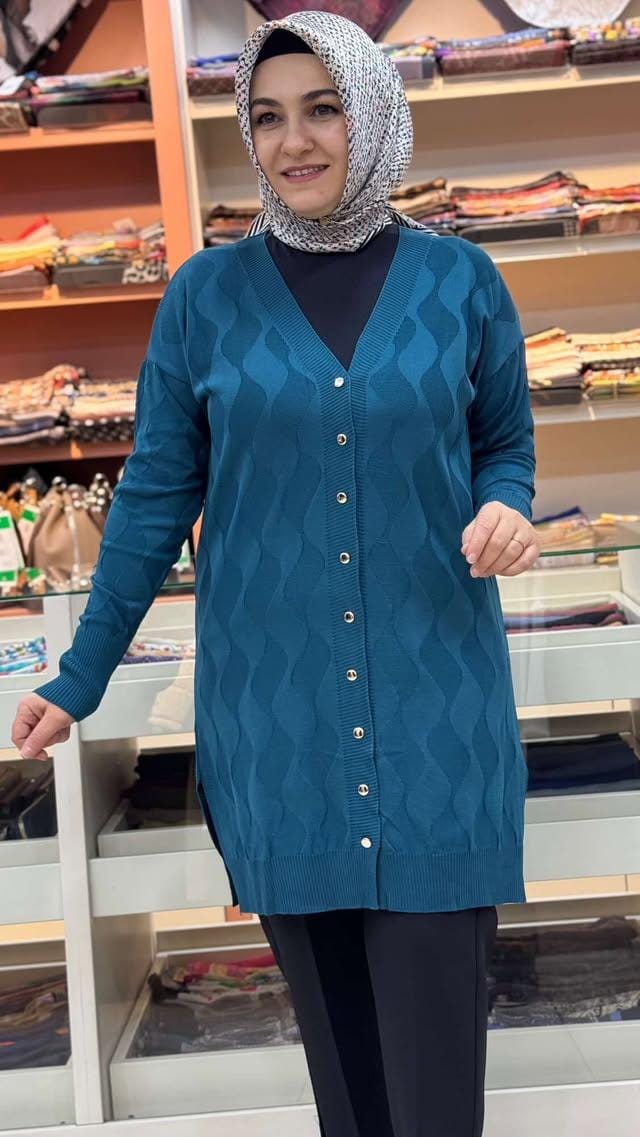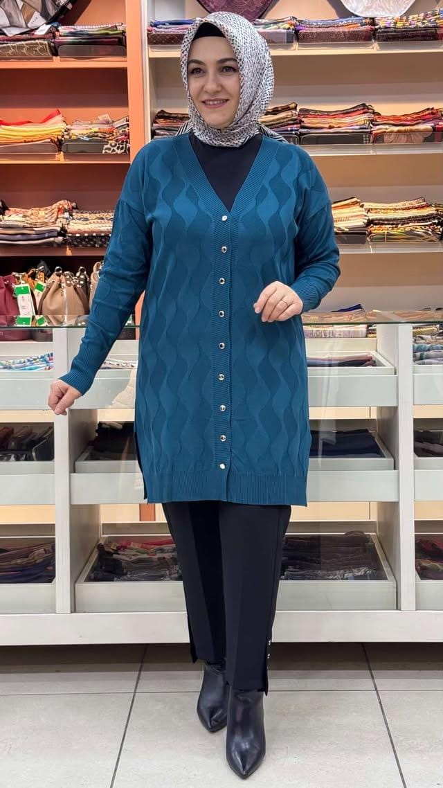 Su Dalgası Desenli Triko Hırka Petrol/3239