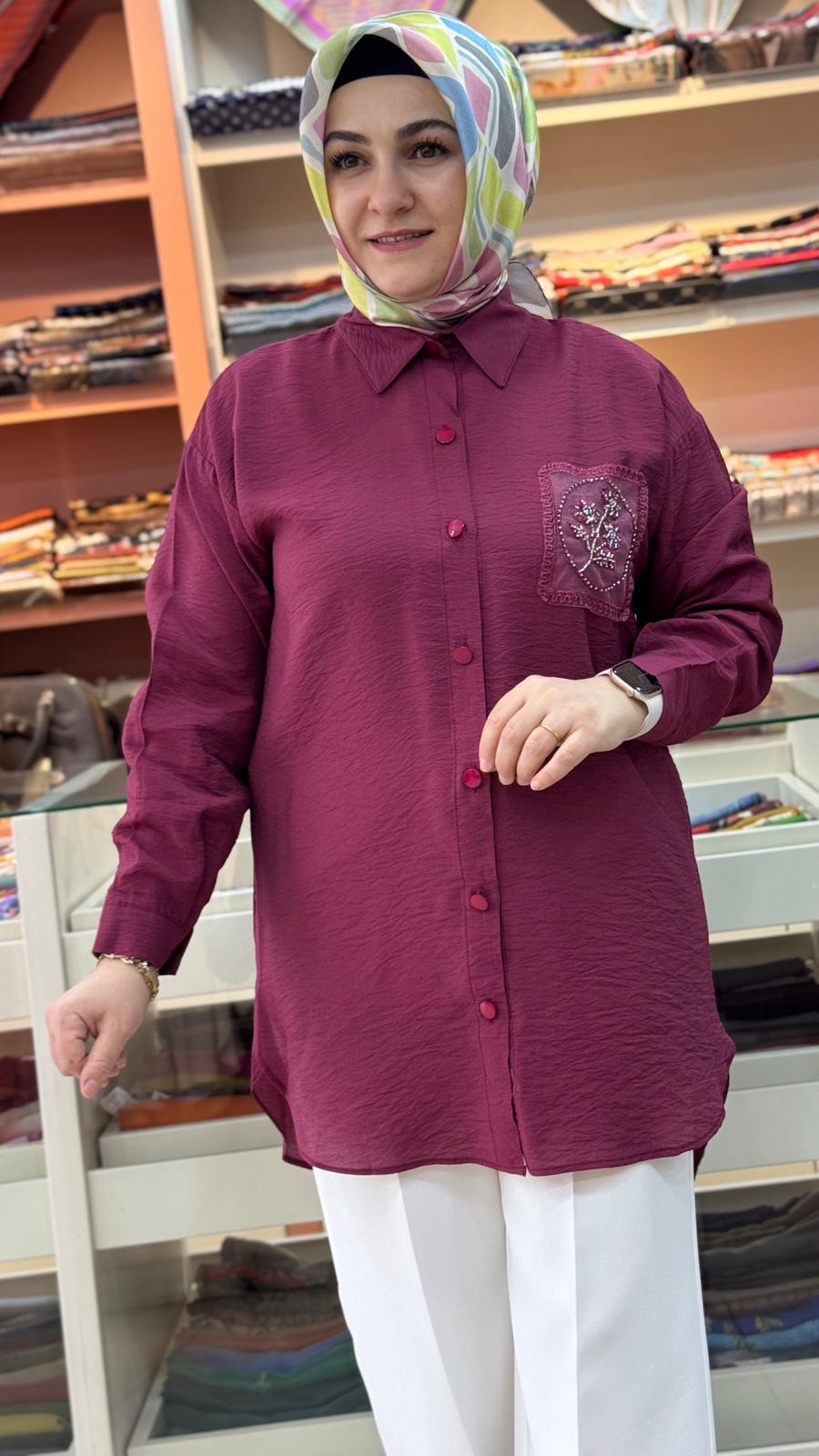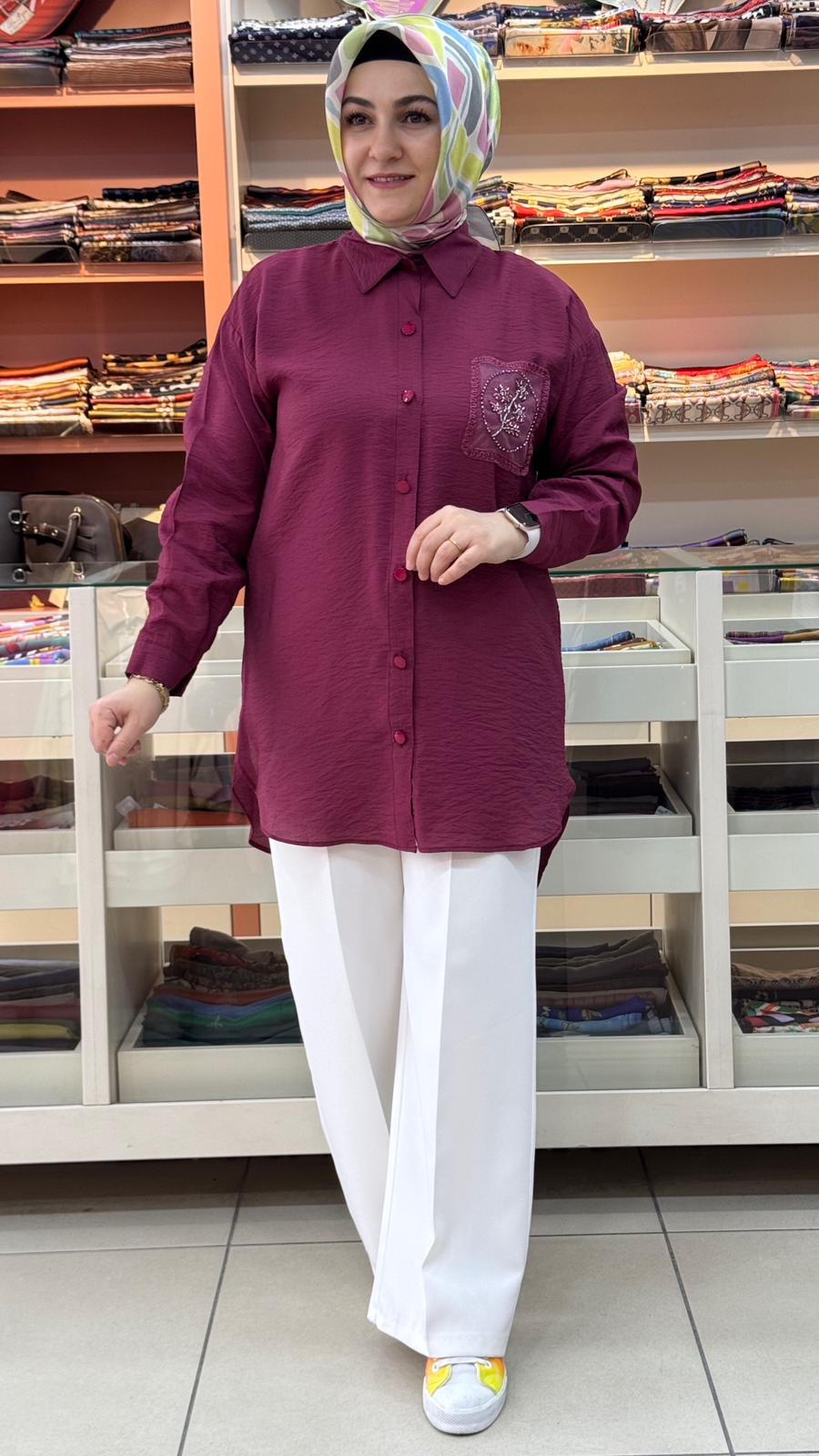 Tül Cepli Nakışlı Gömlek Tunik Bordo/1879