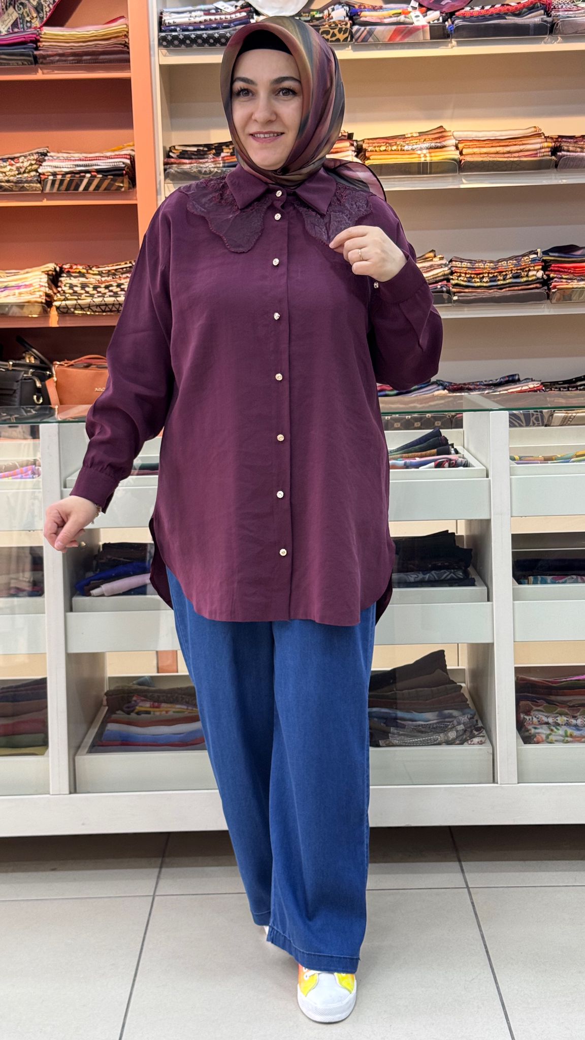 Yakası Organze Tül Detaylı Tunik Bordo / 1883