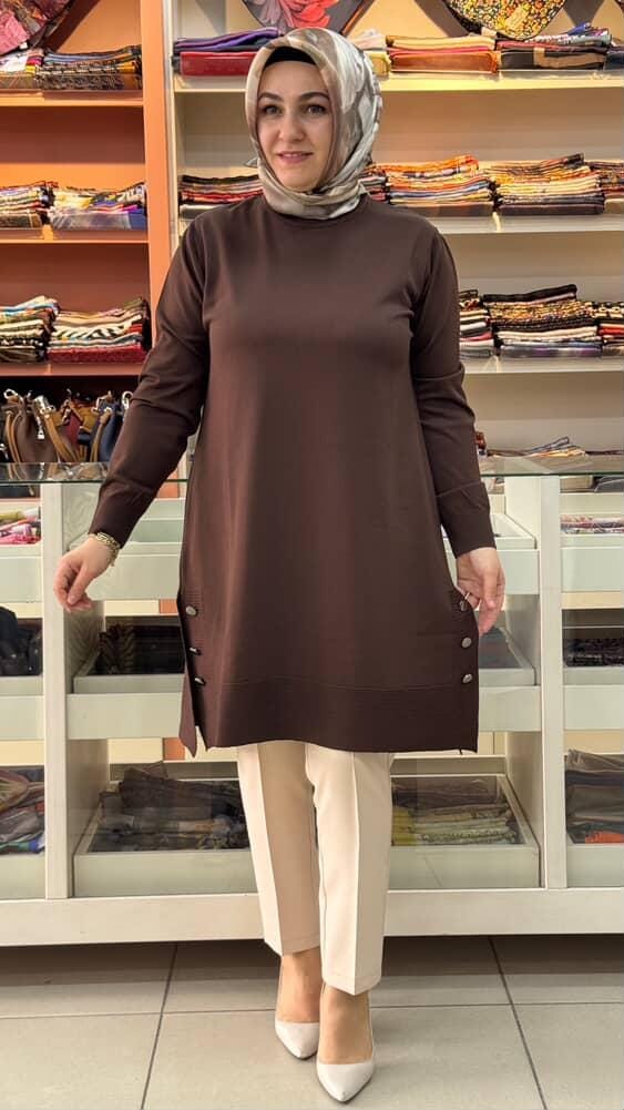 Yanları Düğme Detaylı Merserize Triko Tunik Acı Kahve/1802