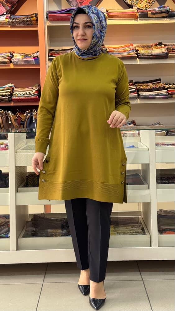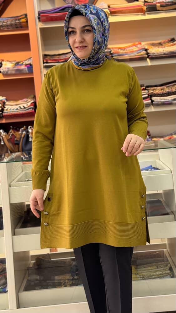 Yanları Düğme Detaylı Merserize Triko Tunik Yağ Yeşili/1802