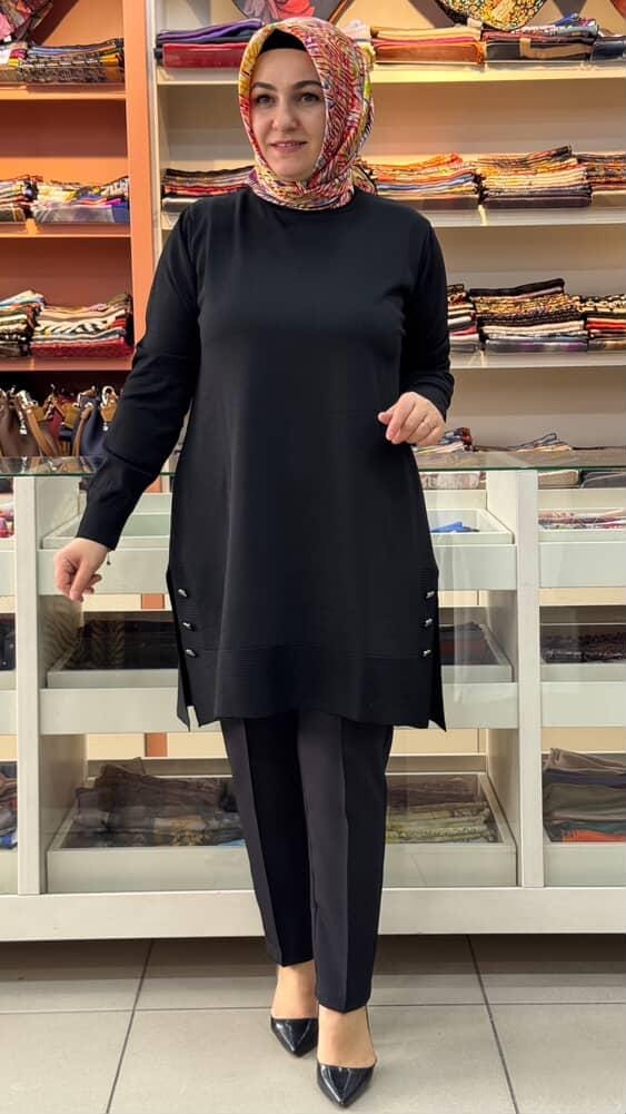 Yanları Düğme Detaylı Merserize Triko Tunik Siyah/1802