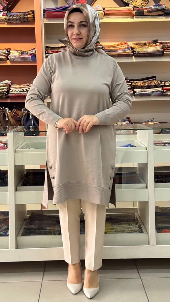 Yanları Düğme Detaylı Merserize Triko Tunik Açık Vizon/1802