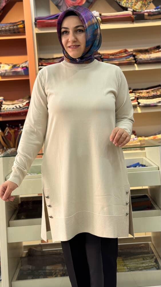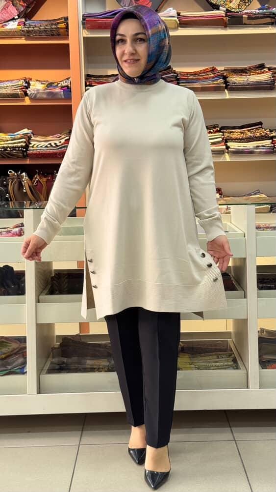 Yanları Düğme Detaylı Merserize Triko Tunik Taş/1802