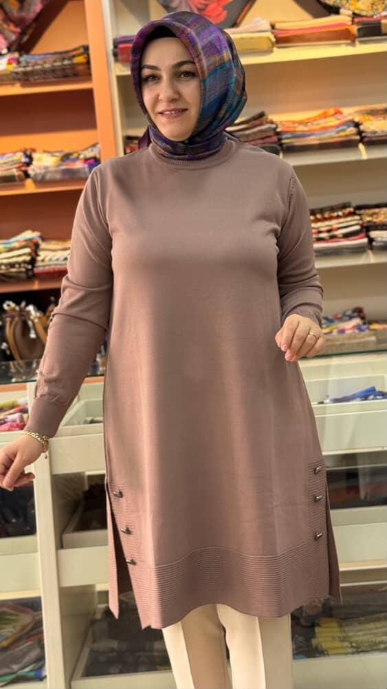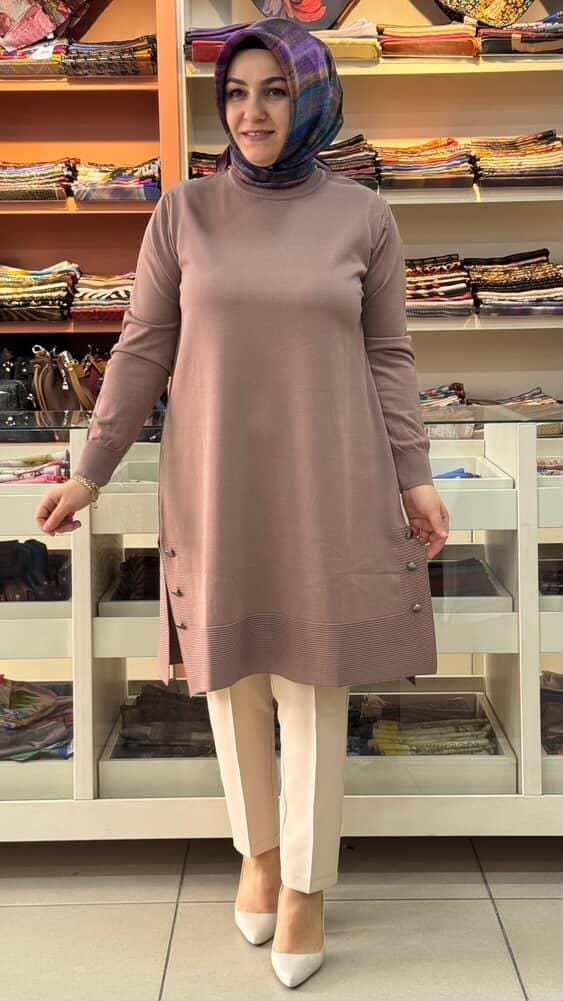 Yanları Düğme Detaylı Merserize Triko Tunik Pudra/1802