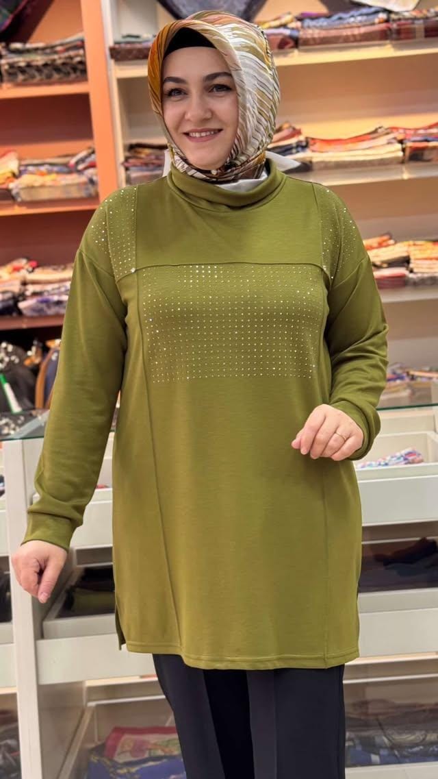 Yanları Yırtmaçlı Pul Detaylı Tunik Yeşil/1832