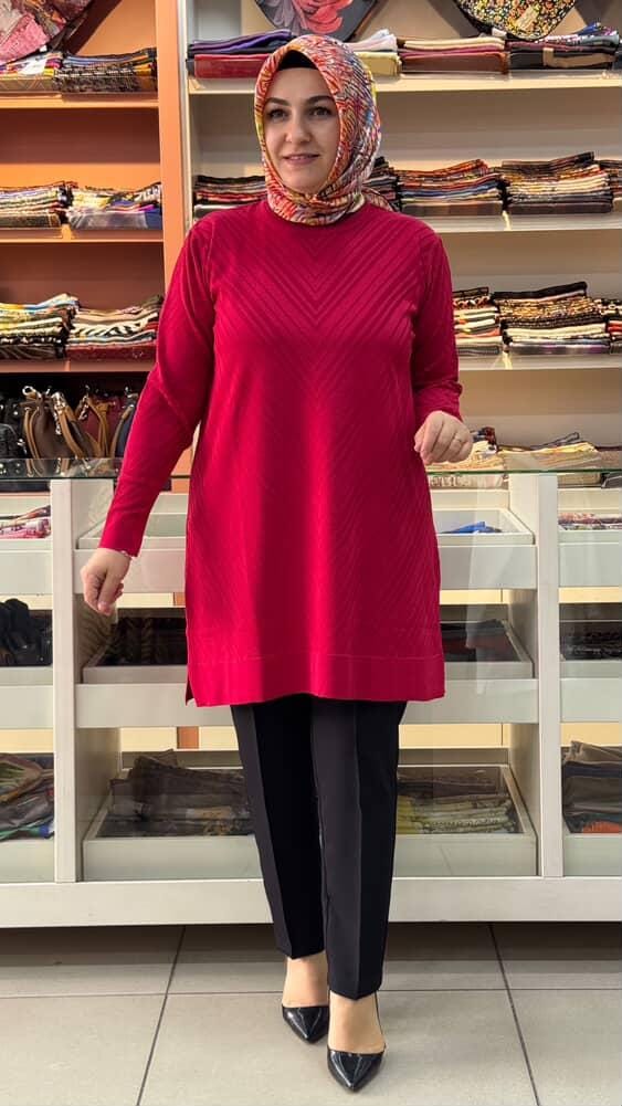 Zikzak Desen Merserize Triko Tunik Kırmızı/1837