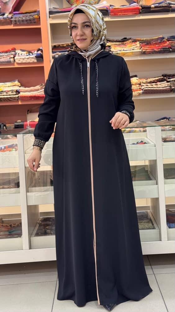 Zincir Detaylı Kapşonlu Ferace Siyah/60010